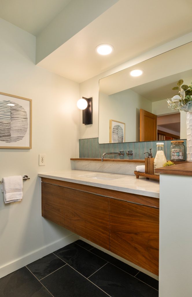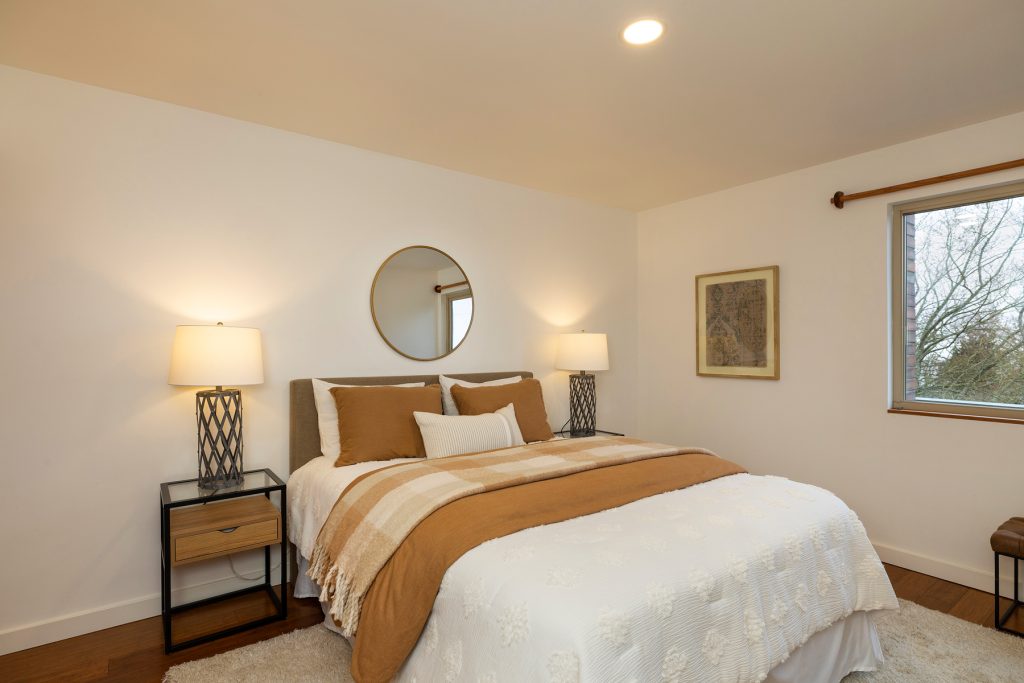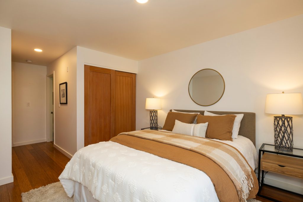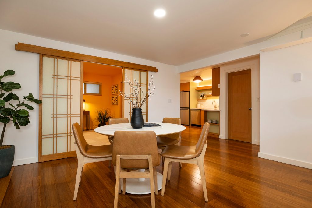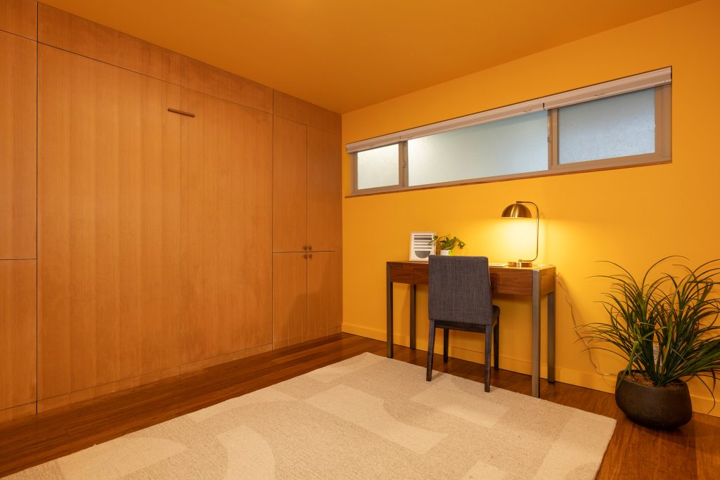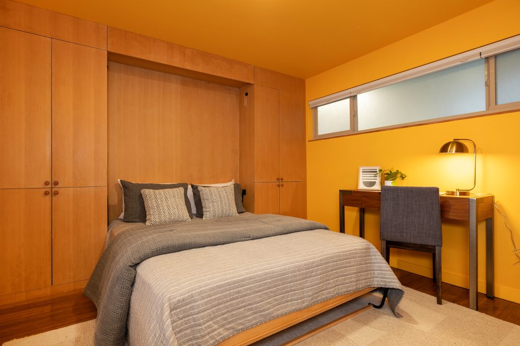 Bamboo and ceramic tile flooring extend seamlessly throughout the home, lending warmth and continuity. The spacious living area opens to a west-facing deck with year-round Olympic Mountain and peek seasonal downtown views, an inviting setting for everyday living and quiet evenings alike. The primary suite enjoys western light, dual custom-organized closets, and opens onto a newly renovated tile full bath with refined finishes including a thoughtful linen closet. The versatile and spacious second bedroom is designed with intention, featuring tatami-style doors that reveal a custom, wall-integrated queen Murphy bed with built-in storage, complemented by an additional wall of closets. Tuck the bed away, and, voila, you have an instantaneous spare room – office, crafts room, dance studio, you choose.